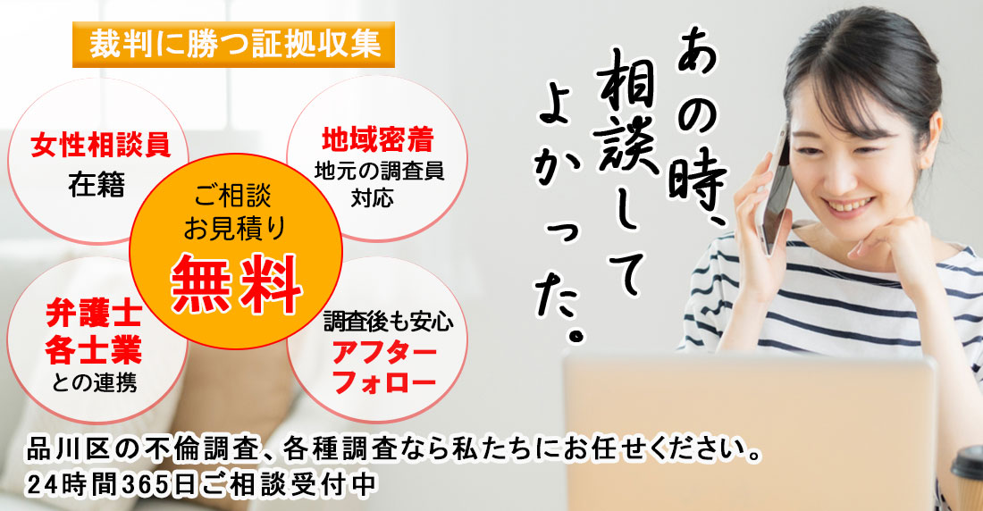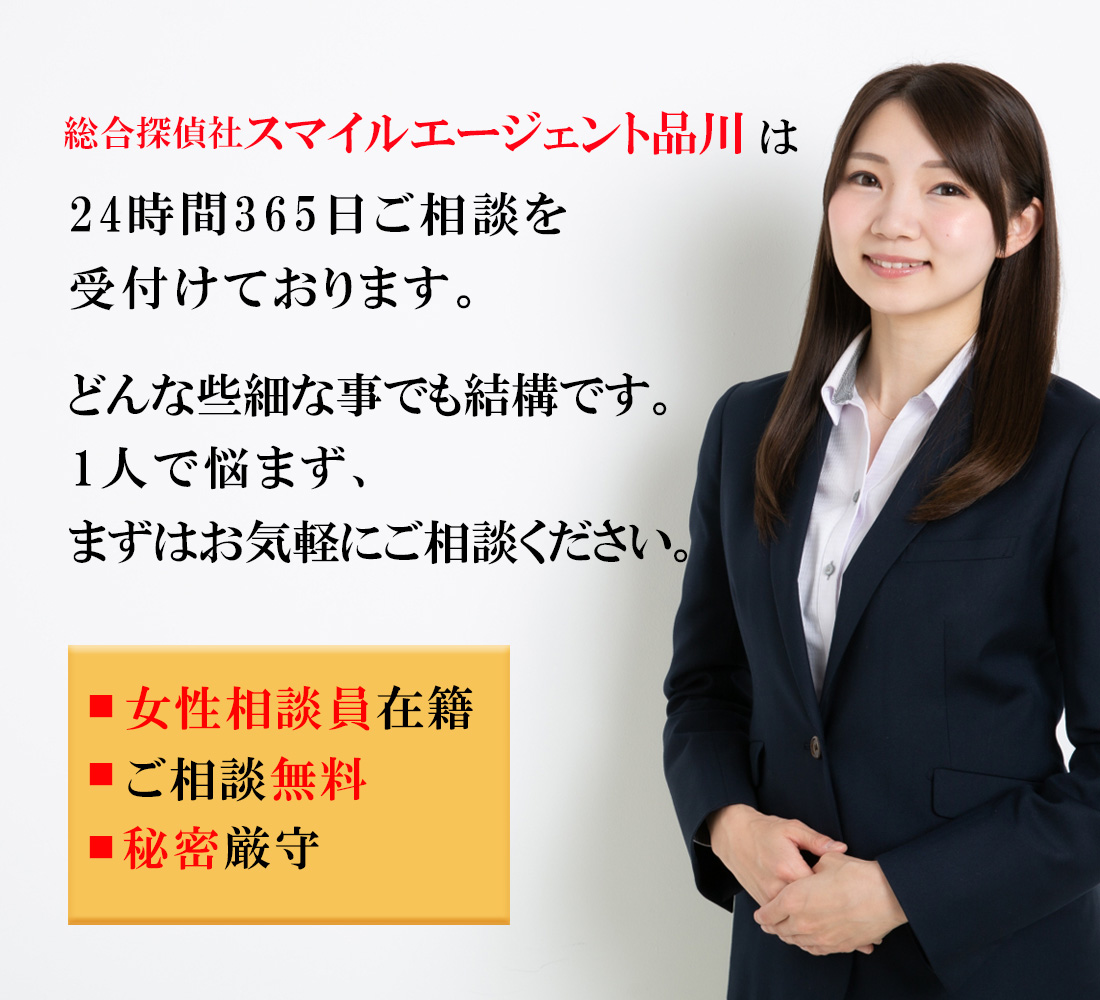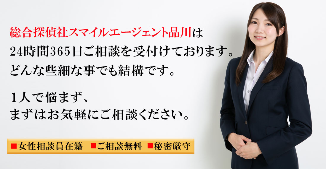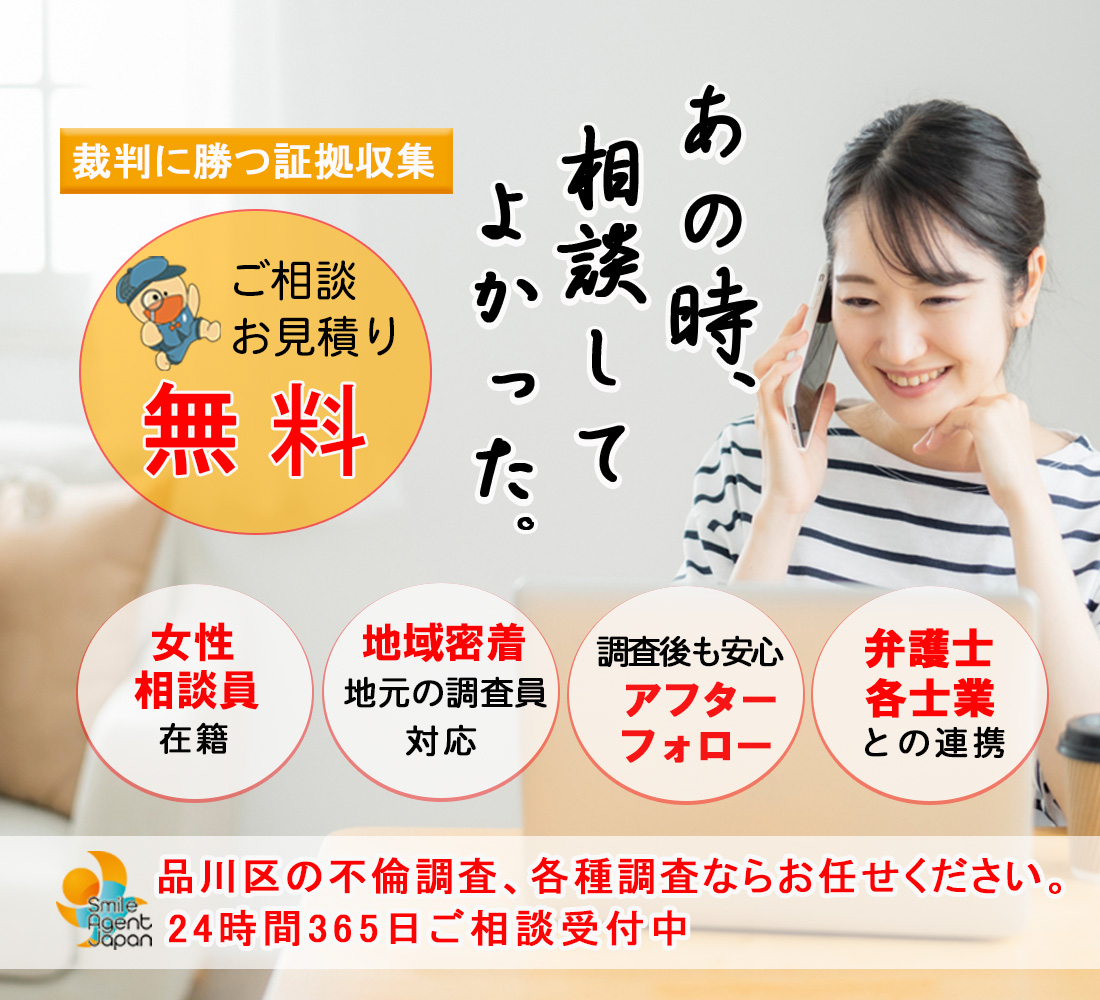 品川区で不倫・浮気調査や行方調査、ペット捜索などの各種調査で探偵をお探しの際にはご相談・お見積りは無料となっておりますので一度、総合探偵社スマイルエージェント品川までお気軽にご相談ください。